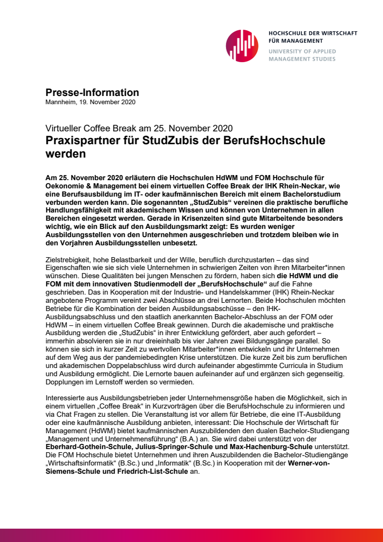 Presseinformation: Die IHK lädt in Kooperation mit der HdWM und FOM am 25.11. zum virtuellen Coffee Break Mehrwert BerufsHochschule.