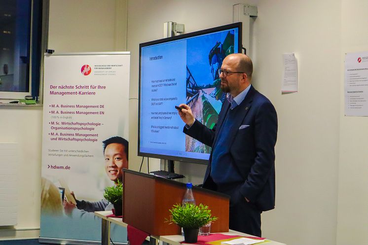 Der Gastredner, Herr Dr. Thomas Peuntner (Global HR Director John Deere), hielt einen sehr interessanten Vortrag zum Thema Smart industrial Vision und Redesign und zeigte den Teilnehmerinnen und Teilnehmern eindrücklich auf, wie essenziell die künstliche Intelligenz für die industriellen Produktionssysteme und für Technologien zur Unterstützung der Kunden heute schon ist. Darüber hinaus gab Herr Dr. Peuntner sehr praxisnahe Einblicke, wie John Deere die Herausforderungen einer intelligenten Industrie durch effektive und innovative Marktstrategien, Change Management Prozesse sowie einer kontinuierlichen Weiterentwicklung der Organisationsstruktur, der Unternehmenskultur und des HR- Bereichs erfolgreich annimmt. Ein lebendiger Dialog mit den Studierenden fand im Anschluss seines Vortrags statt.
