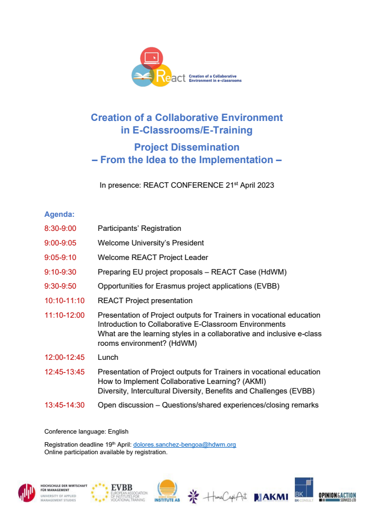 Neben der HdWM erläutern die Projektpartner die Erkenntnisse aus React: AKMIAE AKMI EDUCATIONAL ORGANISATIONSA (Griechenland), BK-CON (Deutschland), EVBB (Deutschland), HumaCapiAct (Italien), Nordic Horizon Institute AB (Schweden), Opinion & Action Services Ltd (Zypern).
