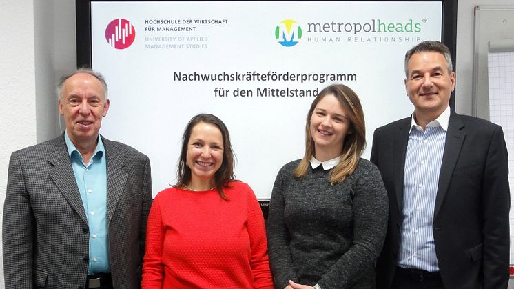 Mit Beginn des Jahres 2019 schloss die Mannheimer Personalberatung metropolheads einen Kooperationsvertrag für ein Nachwuchskräfteförderprogramm Mittelstand. Die Gesellschaft berät Unternehmen bei der Besetzung von Experten bis zur ersten Führungsaufgabe und wird zukünftigen Absolventen der Hochschule bereits vor dem Abschluss beratend die Attraktivität und beruflichen Chancen des Mittelstands näherbringen und sie in gezielte Positionen entwickeln. Das Projekt wird von Yasmin Köhler, Leiterin Administration und Research, begleitet.